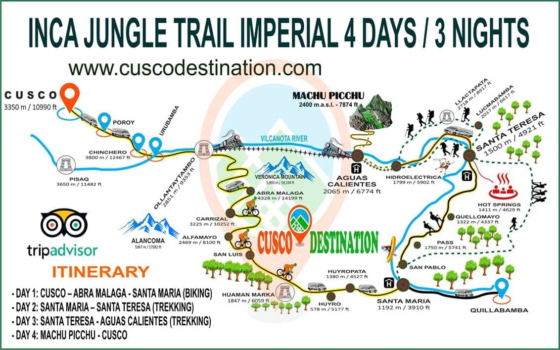The Inca Jungle Trail Imperial To Machu Picchu combines adventure sports such as mountain biking, river rafting, zip line, hot spring and trek for 4 days until you reach Machu Picchu (visite Huyana Picchu or Machu Picchu Mountain).