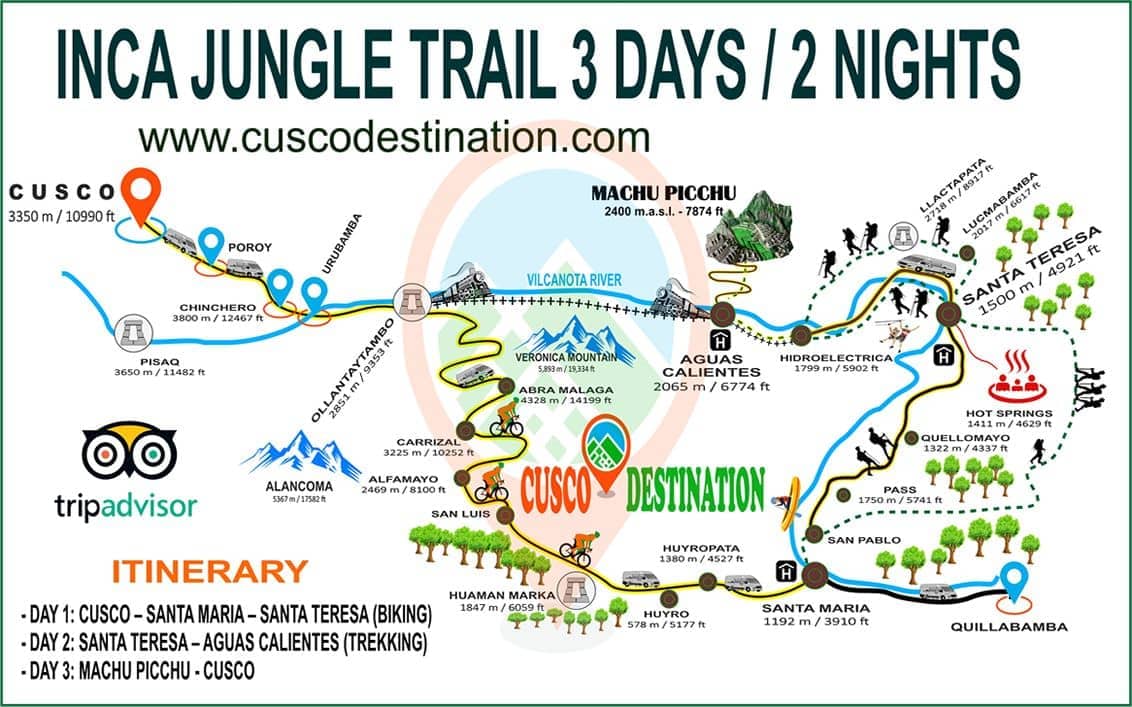 Short Inca Jungle Trail combines adventure sports such as mountain biking, rafting, zip line and trekking for 3 days until you reach Machu Picchu and one of the additional mountains "Machu Picchu Mountain" or "Huaynapicchu". The Inka Jungle Trail is the favorite tour for young people from all over the world who come to Cusco in search of adventure and extreme sports. As a Tourism Agency located in Cusco we offer a differentiated service; with an exclusive route, trained guides (real command of English and local history), bicycles equipped for downhill, the safest rafting and zipline services. We recommend our passengers book in advance to have everything insured and avoid unnecessary risks such as loss of equipment, lack of access to Machu Picchu, Machu Picchu Mountain, Huayna Picchu or even worse, being stranded in Aguas Calientes (no return train).